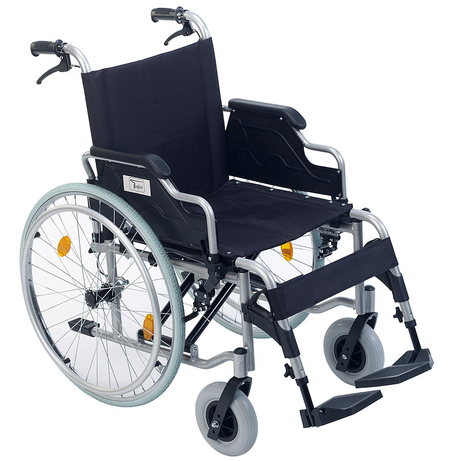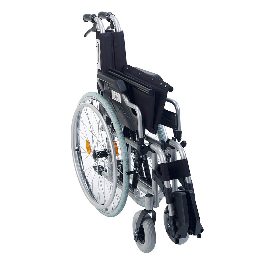 Masszív alumínium kerekesszék. Összecsukható, tolókarokkal és kézifékekkel felszerelve.