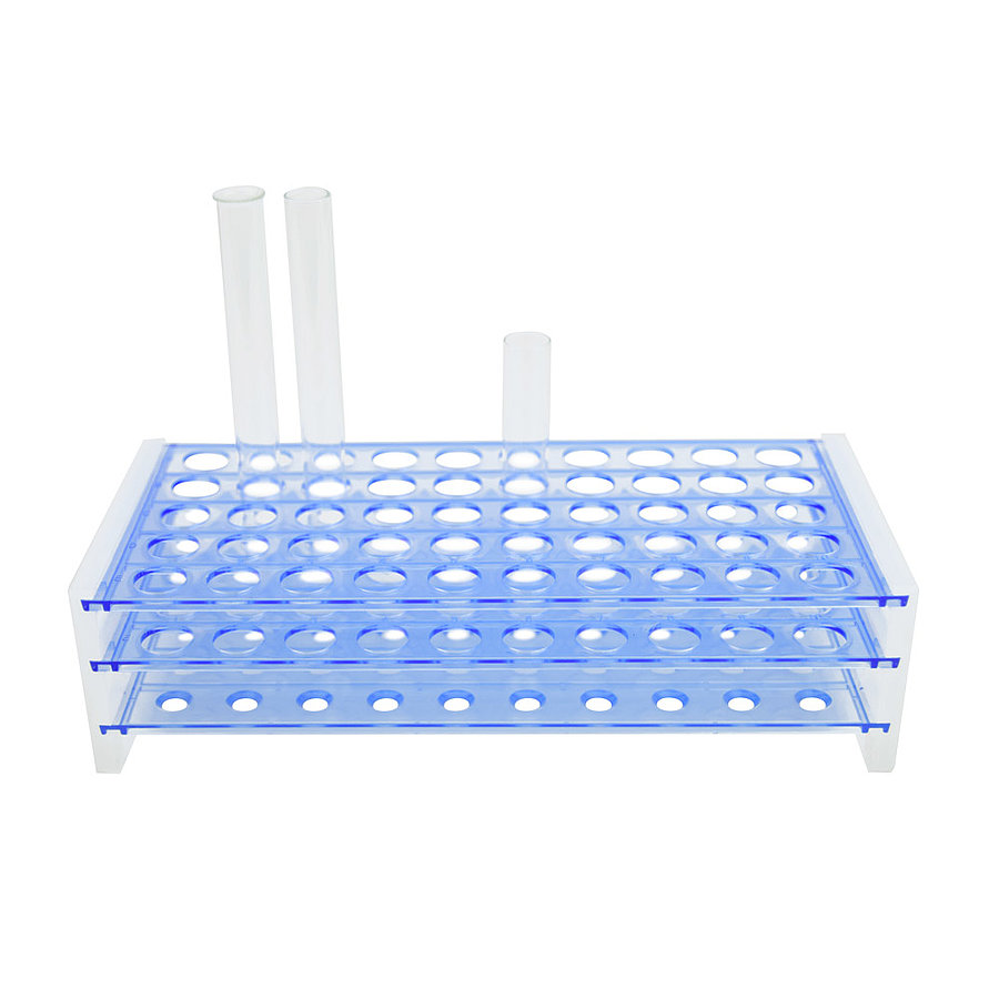Műanyag kémcsőállvány akár 50 kémcső elhelyezésére. Az első oszlop és az első sor számozott, így mindegyik minta egyértelműen elrendezhető a pozíciója szerint. A kémcsőállvány a sima felületnek köszönhetően könnyen tisztítható. Az oldalán fogantyúval van ellátbóva, így a minták a laboratóriumban biztonságosan mozgathatók.