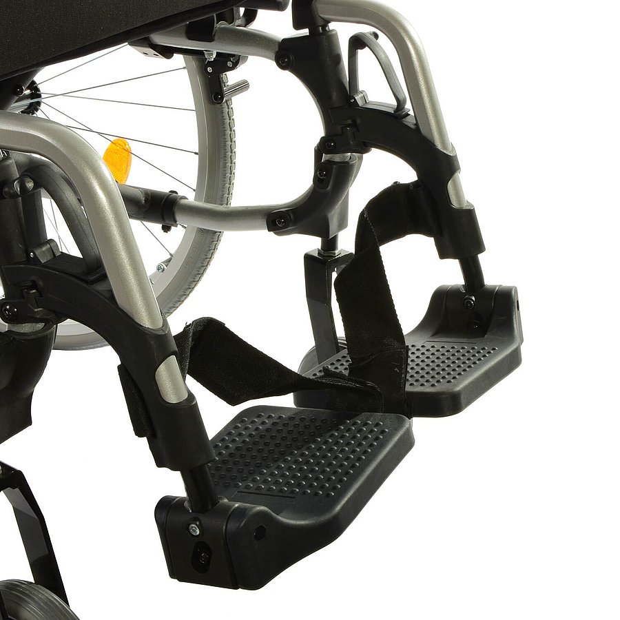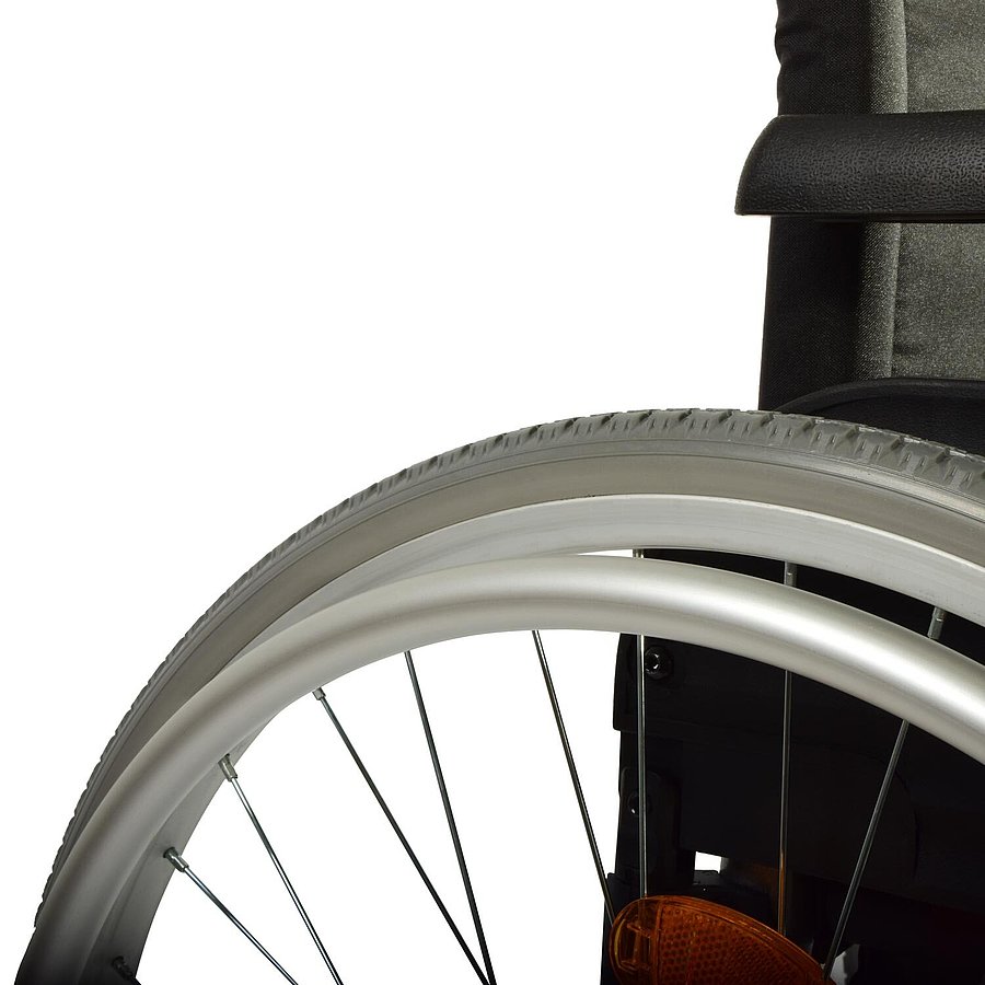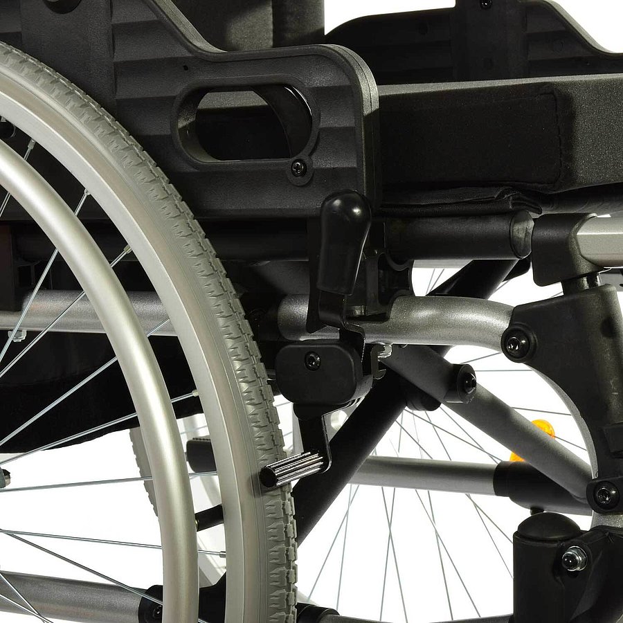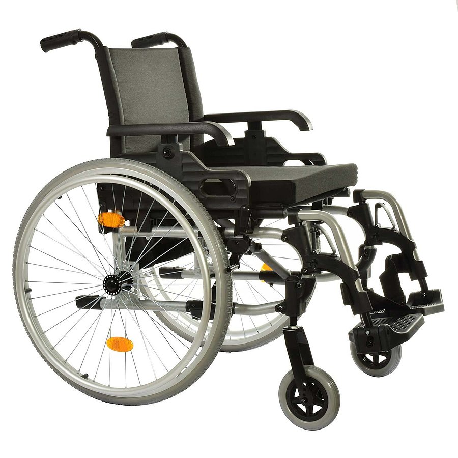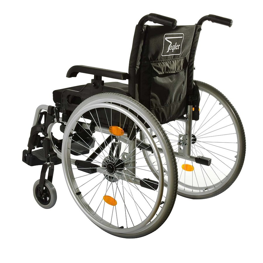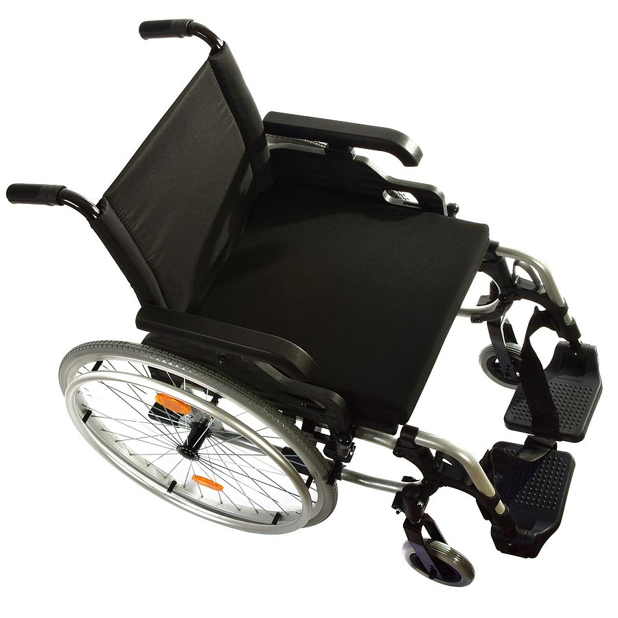 Összecsukható kerekesszék. A beteg és az egészségügyi személyzet egyaránt mozgathatja. Az ülőpárnának és a párnázott háttámlának köszönhetően a kerekesszék magas szintű kényelmet kínál.