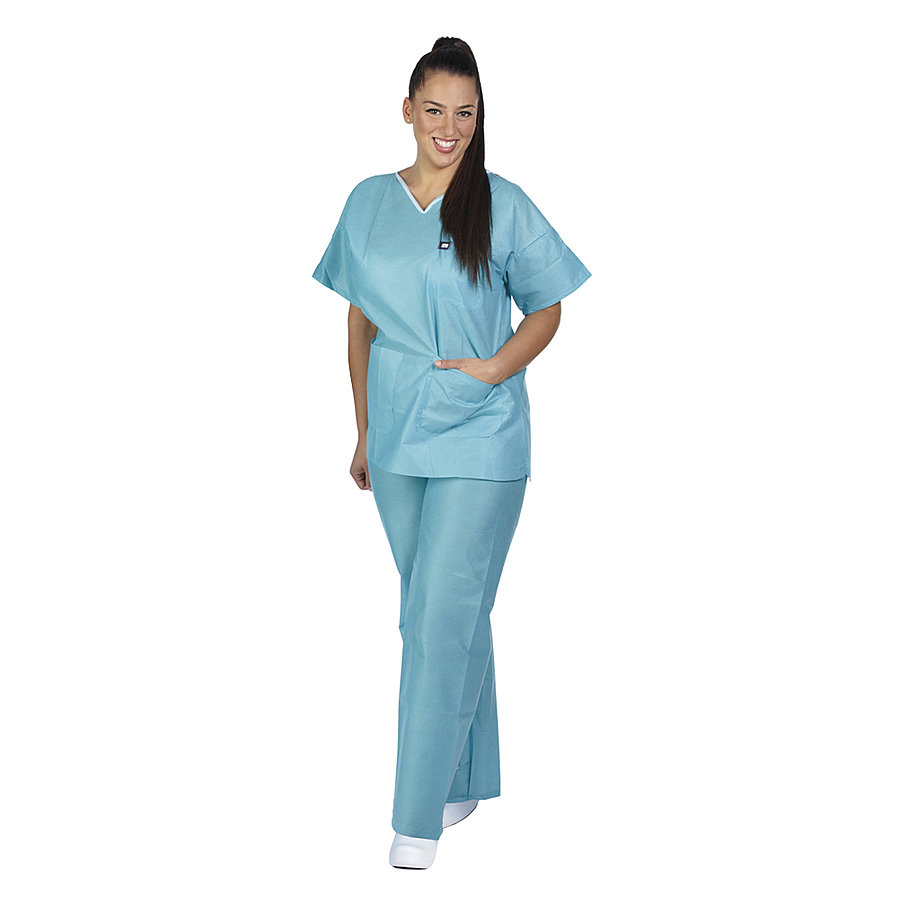 Egyszerhasználatos tunika nadrággal. Lélegző, szakadásálló SMS anyagból az optimális kényelem érdekében. A készlet tunikából és nadrágból áll.